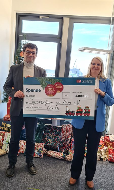 Insgesamt 80 Geschenke wurden am 16.12.2025 in der Zentrale der DB-Fahrwegdienste GmbH an Jugendwohnen im Kiez überreicht. Die Wunscherfüller:innen der Deutschen Bahn sorgten dafür, dass die Geschenke liebevoll und individuell auf die Wünsche der jungen Menschen abgestimmt verpackt wurden. Zusätzlich erhielt der Träger eine Spende in Höhe von 1.000 Euro. Das Geld kann für Projekte eingesetzt werden, die ansonsten nicht finanziert werden könnten. Klaus Peter Dilger, einer der drei Geschäftsführer*innen von Jugendwohnen im Kiez, nahm den Scheck feierlich von Frau Wißmann, der Geschäftsführerin Personal der DB-Fahrwegdienste GmbH, entgegen.